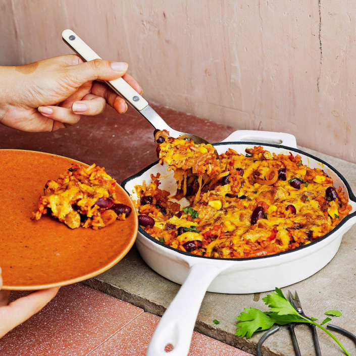Épluchez l’oignon et la gousse d’ail. Ciselez finement l’oignon, écrasez la gousse d’ail à l’aide d’un presse-ail. Faites dorer l’oignon 10 mn dans 2 c. à soupe d’huile bien chaude. Ajoutez l’ail et le riz, les tomates concassées avec leur jus, les épices, le persil lavé et ciselé, puis l’eau. Salez et poivrez. Laissez mijoter 20 mn, au bout de 15 mn ajoutez les haricots rouges et le maïs.